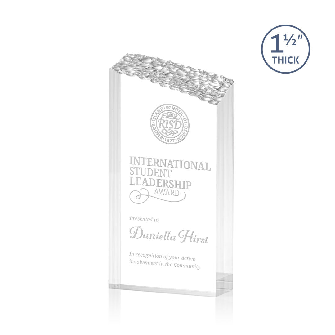 The Warwick Award features a solid 1.5" thick Acrylic tower with a slanted top featuring a molded mountainous texture. A striking recognition piece to honor a monumental achievement.