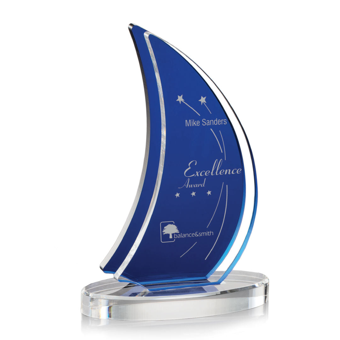 The sail shape of the Matsuda Award is given a sophisticated presentation with azure acrylic to echo the silhouette and define the laser engraved imprint with reflective color.