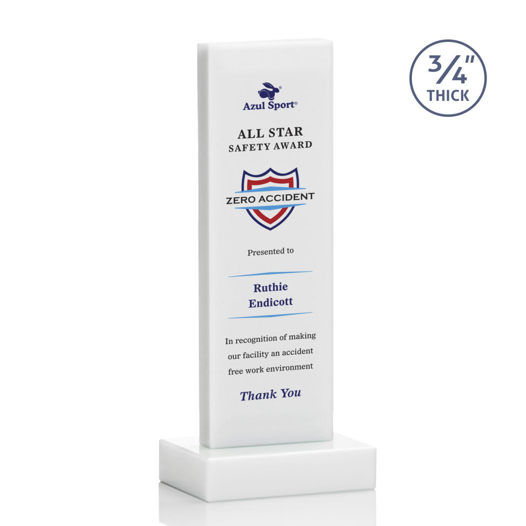 The Marvelous Hathaway Award features a striking White Crystal Tower mounted on a matching thick crystal base. A sensational award for a star recipient. Available with Deep Etch and 1 Colorfill or Full Color VividPrint™.