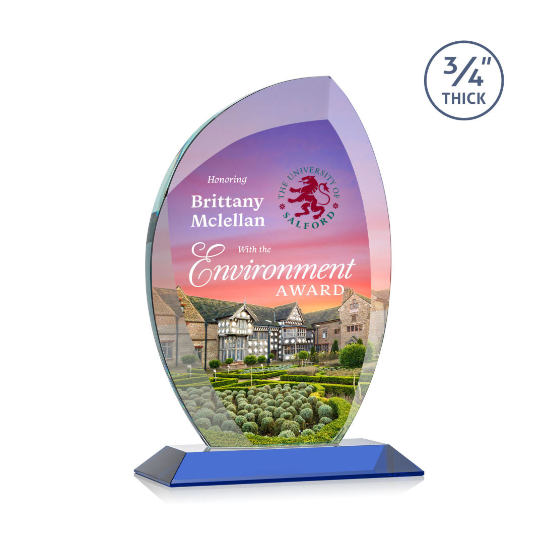 The Wichita Award features thick 3/4" Starfire Crystal with deep sweeping bevels that elegantly arch around your words of recognition with shimmering light. A modern monument for any special achievement. Includes full-color VividPrint™ so the only limitation is your imagination.