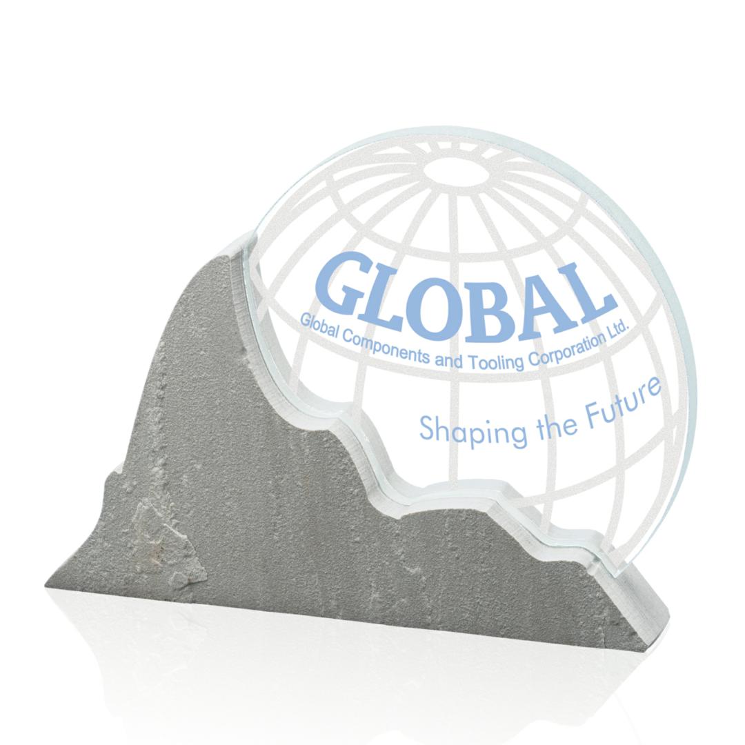 One of a set of substantial awards in sandstone and starfire glass. Sandstone, as a major structural element, reinforces the impression of weight, solidity and permanence in an award. In the Artesia, an aquashaped starfire circle with a sculpted bottom edge is fused to a correspondingly sculpted sandstone base. Second side etch and colorfill optional. Due to the nature of sandstone, the exact thickness, color and surface texture may vary from piece to piece. Etching or colorfill on sandstone is not available.