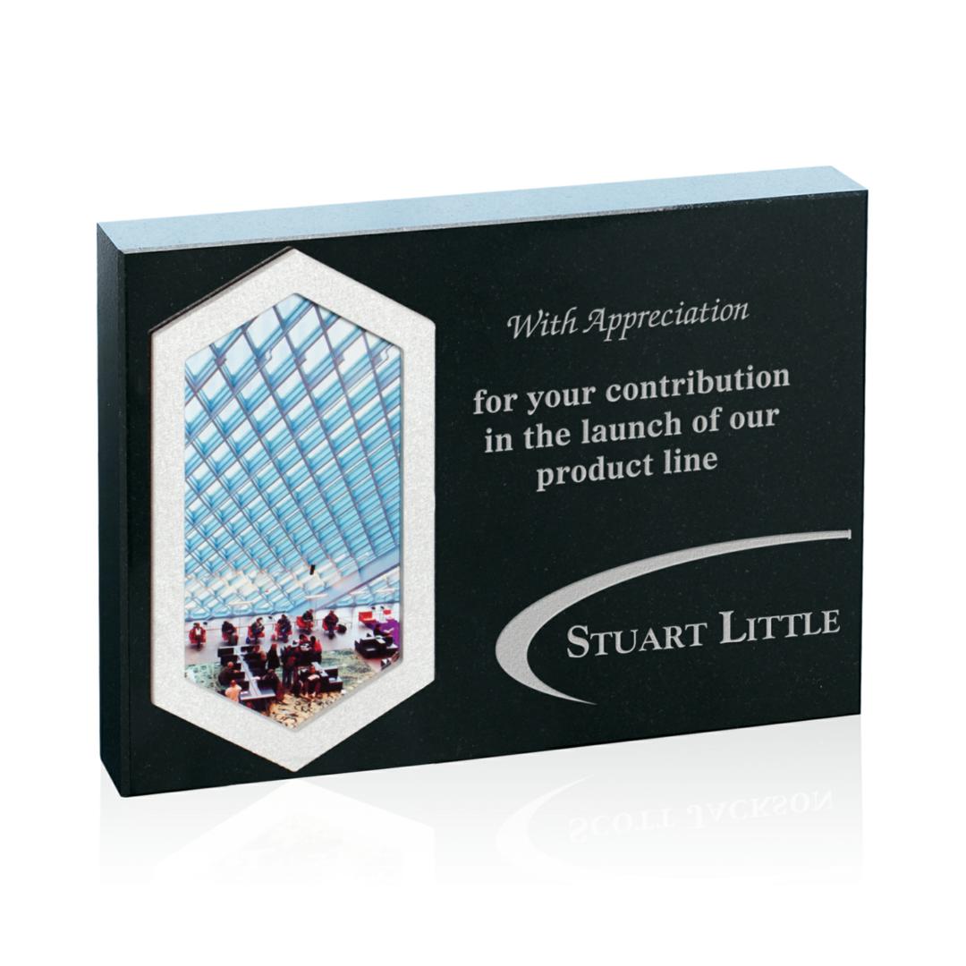 A freestanding 4"X6" polished black granite rectangle, the Heyden features a full color sublimation plate enclosed by a hexagonal brushed aluminum frame. Perfect for adding portrait photos to personalized awards or...