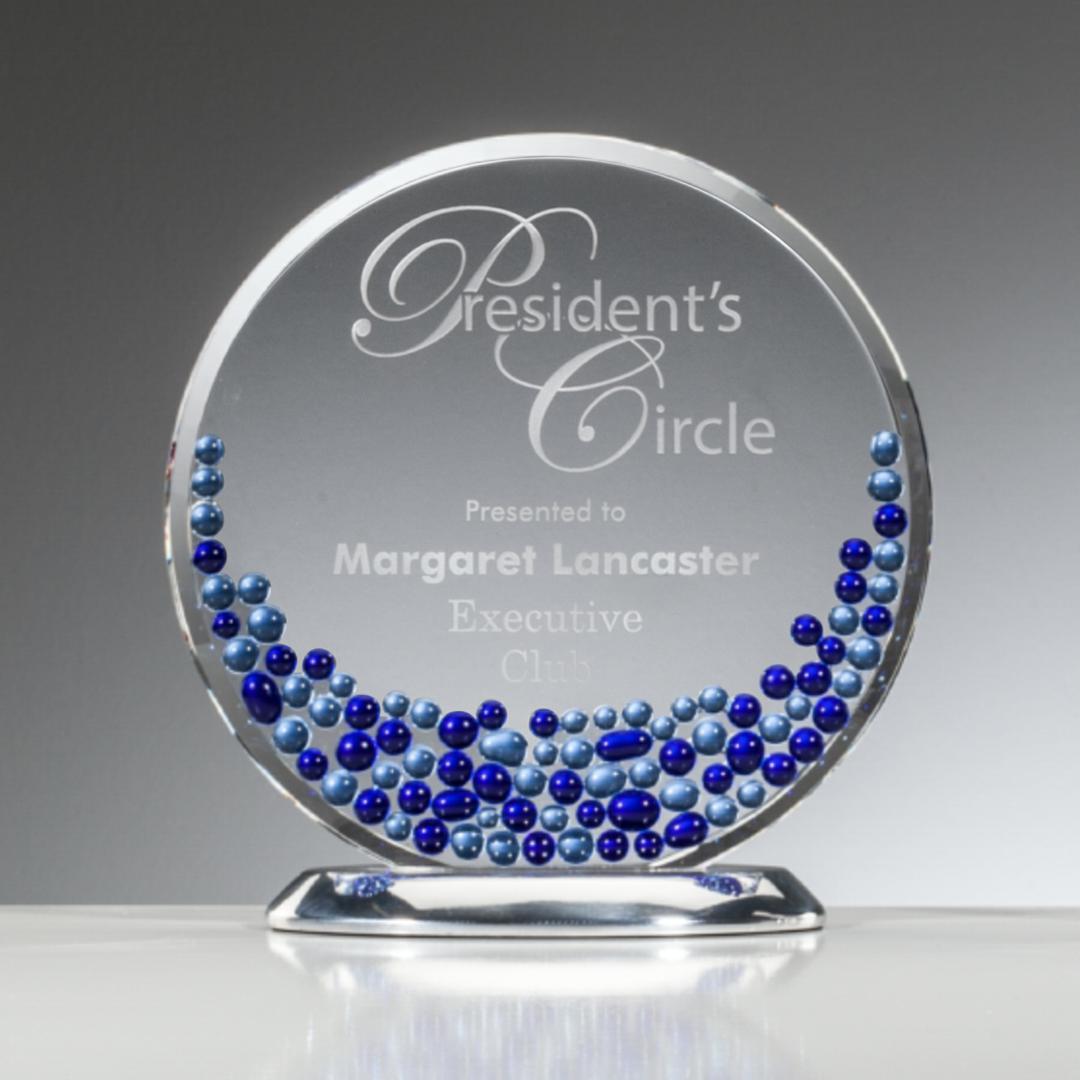 Beautifully beveled starfire crystal disk is complimented by a mosaic of sapphire and aquamarine crystal beads on the front and back. Each crystal drop is applied by hand and fired in our kilns to ensure durability and that no two are alike.
