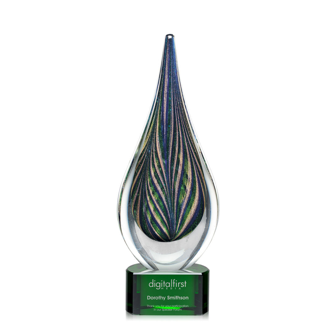 Clear glass surrounds shades of iridescent art glass that form this peacock feather encased within a teardrop shape of glowing beauty. The sculpture is mounted on an emerald optical crystal base creating a stunning recognition piece perfect to commemorate a landmark event or achievement.