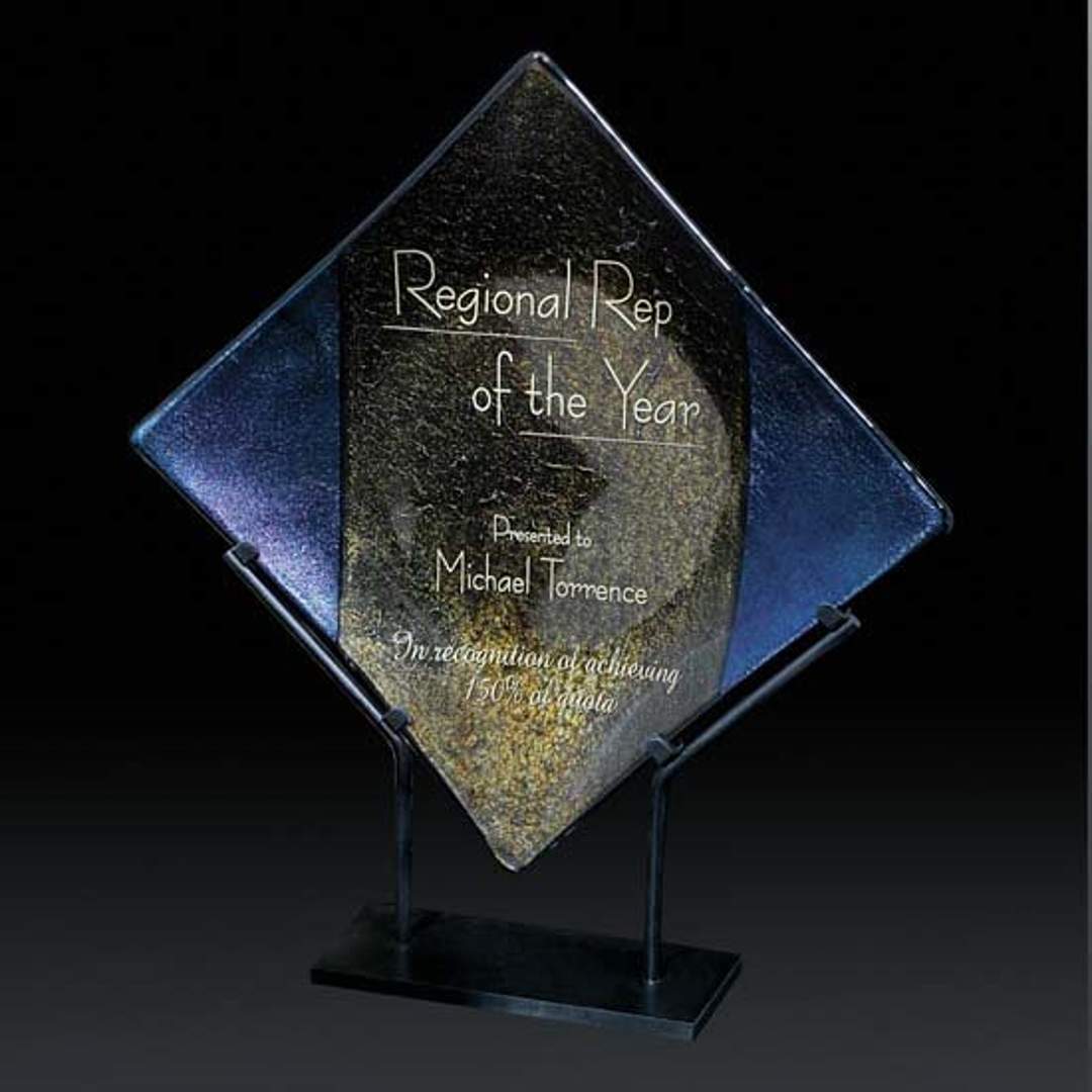 Kurt McVay is a master glass maker using rich metallic colors in exciting new combinations. The precise layering of color and geometric patterns are the hallmark of this master craftsman. Each piece is hand made and signed by Kurt and is shipped with a hand crafted black steel stand.