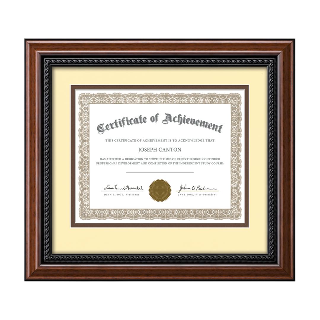 The rich mahogany finish of the Weyden certificate wood frame is enhanced with an ebony stained carved rope accent. The wood frame is enhanced with a double matte of dove grey...