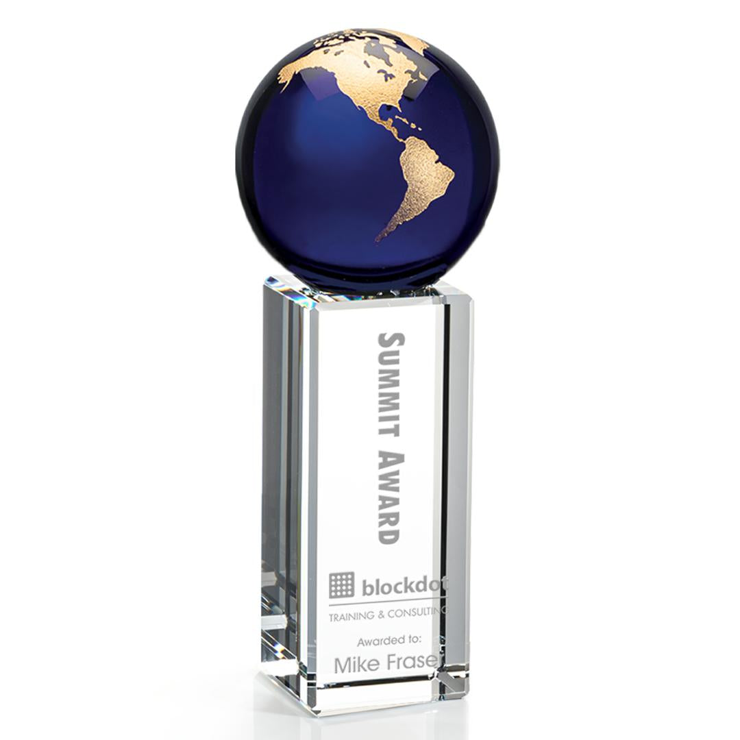 The Luz Globe award features a Blue Optical Crystal globe perched on an Optical Crystal pillar. Available in gold or silver.