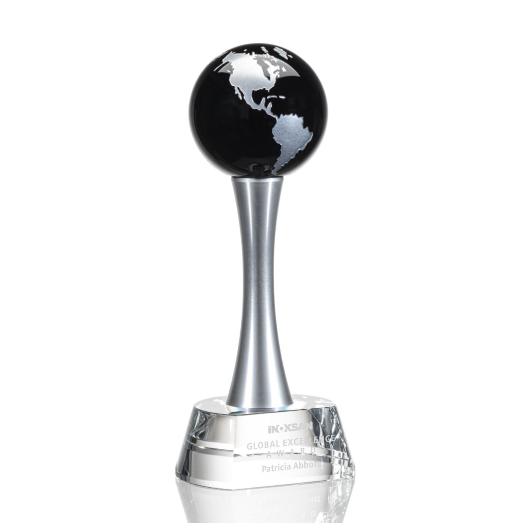 The statuesque Willshire Globe Award features a Black Optical Crystal Globe perched atop a waisted aluminum pillar and mounted on a thick optical base. Perfect for recognizing a global achievement.