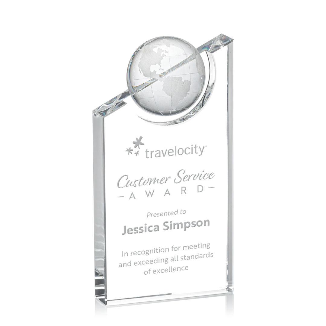 A novel and elegant representation of the global theme. The slanted top of this freestanding optical crystal rectangle features a polished semicircular opening to accommodate a permanently affixed and suspended half-globe (with the Americas etched). A distinctive and balanced award with a large etching area, appropriate for any organization or person with a global vision or an international perspective. Globe comes in Clear with frosted continents or Blue, Black or Green with continents colorfilled gold or silver.