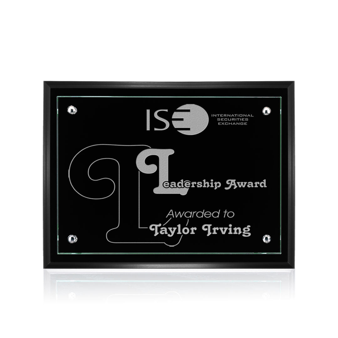 The 7" X 9" Dufferin plaque is made from 0.375" jade glass and a black wood product backing. Also available in 8" X10", 9" X 12", 10.5" X 13", 12" X 15" and 16" x 20" versions, with rosewood-colored backing and in Starfire glass. Please specify vertical or horizontal format.