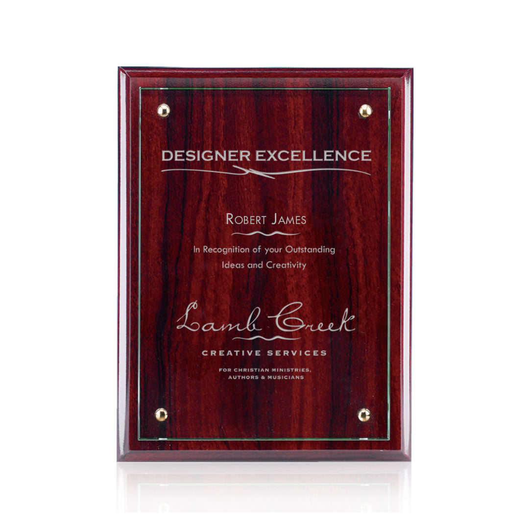 The Dufferin plaque is made from 0.375" Jade glass and a rosewood-colored, wood product backing. Black backing with Starfire glass is also available. Please specify vertical or horizontal format.