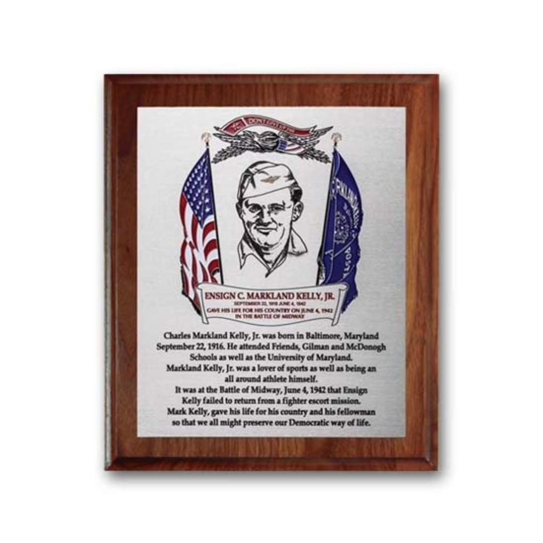 The Metal Etched and Colorfilled process accents the recessed area of a gold or silvertone plate with the color of your choice, mounted to our walnut plaque with cove edges.