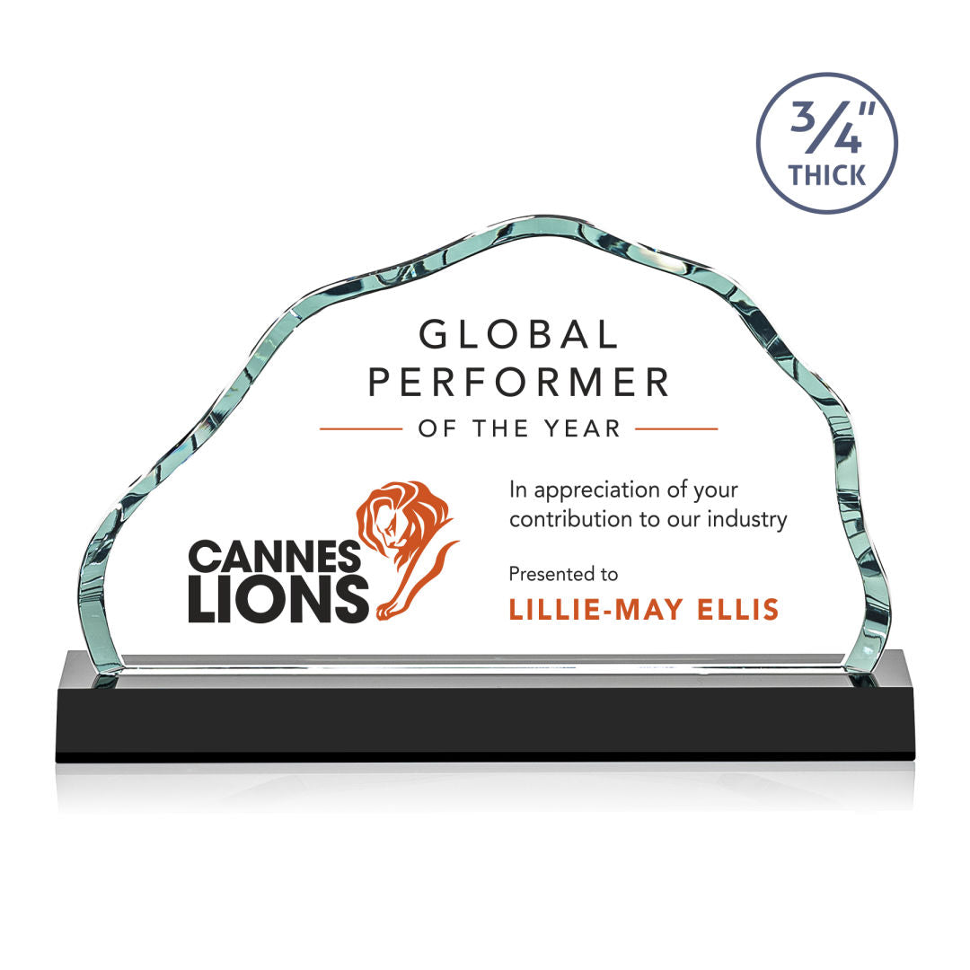 The Starfire Crystal Highbridge VividPrint™ Award is a magnificent ¾” thick beveled iceberg that forms an incredible frame for your mountainous achievement. The black crystal base refracts through the edges of the award for a dazzling show of dramatic ebony reflections. 2nd Position Etch Optional.