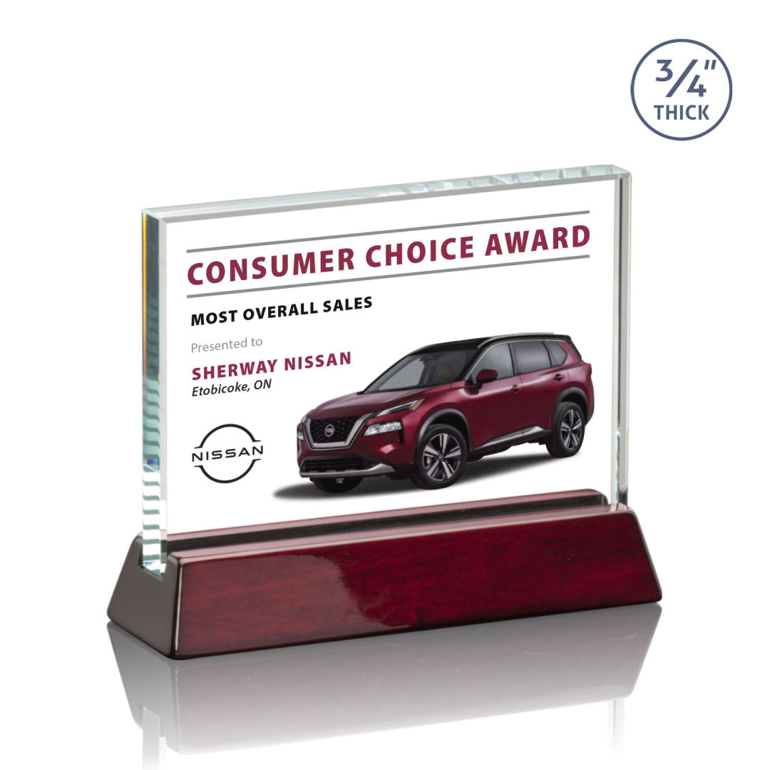 Elegant Rectangular Starfire horizontal award on a high-gloss piano rosewood finish base. Available in 4 sizes. Let your message POP with full color VividPrint™.