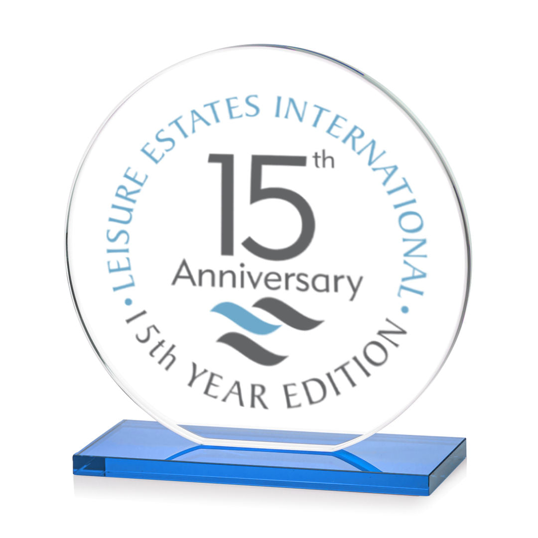 Our extraordinary cut Victoria Award features a flat edged Starfire disc mounted on an elegant sky blue crystal base to create a sleek award to recognize excellence. Let your message POP with full color VividPrint!
