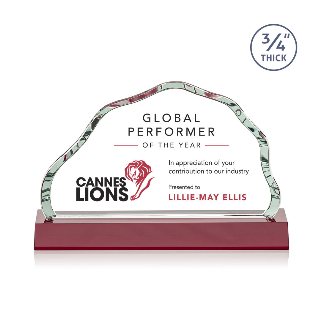 The Starfire Crystal Highbridge VividPrint™ Award is a magnificent ¾” thick beveled iceberg that forms an incredible frame for your mountainous achievement. The colored crystal base refracts through the edges of the award for a dazzling show of ruby red reflections. 2nd Position Etch Optional.