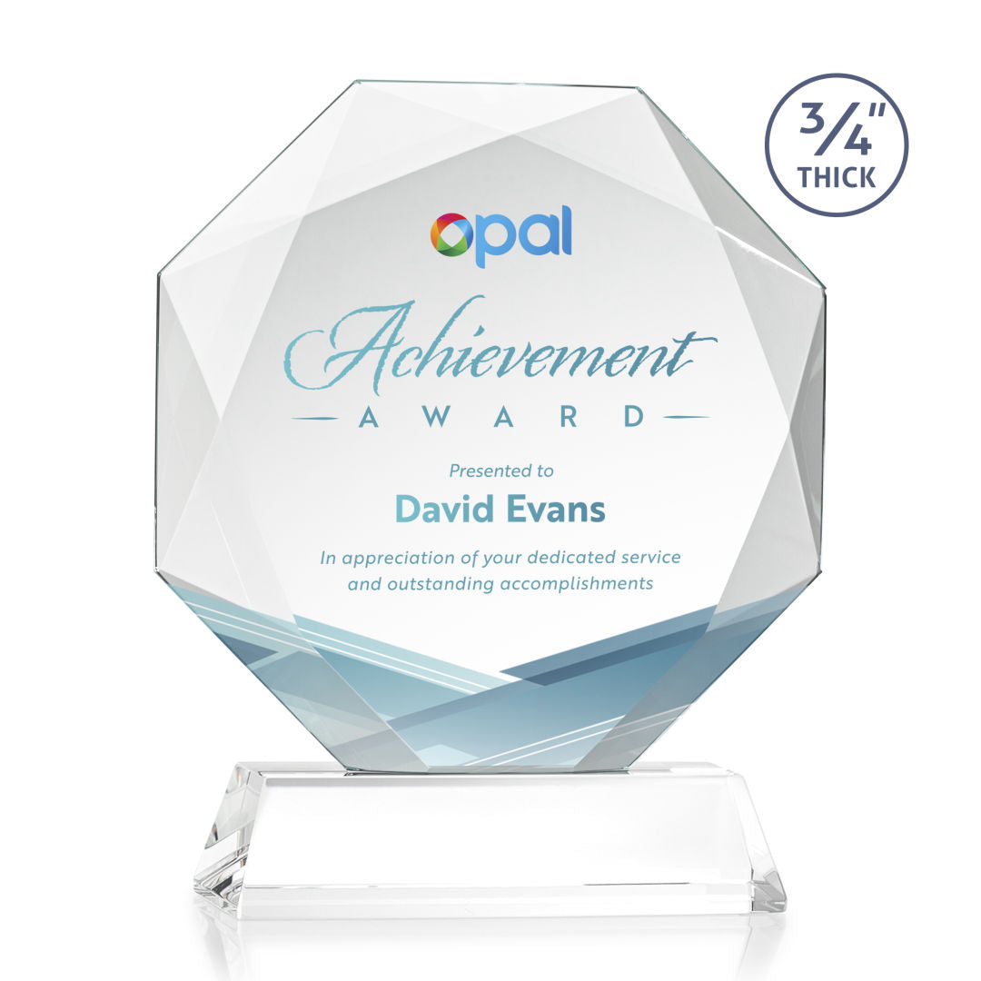 The Spectacular Multifaceted 0.75" Thick Bradford Starfire Octagonal Award with full-color VividPrint™. Featuring deep recessed bevels forming a striking diamond design. A magnificent award to recognize an equally magnificent accomplishment. Mounted on a tall tapered Optical Base in your choice of 8 distinct colors. Second position imprint optional.
