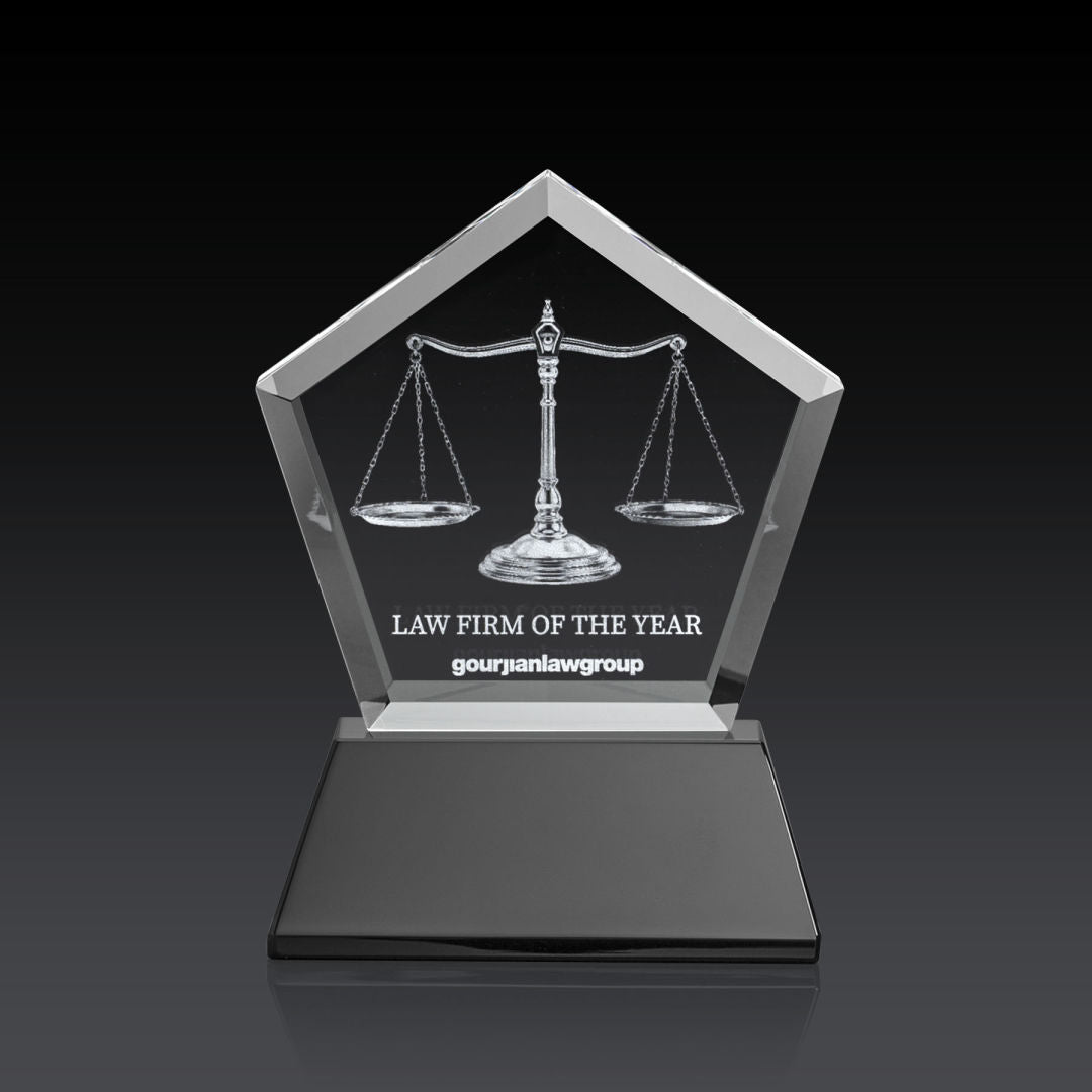 The Genosee Dimensions 3D award features a thick optical crystal pentagon with a beveled frame and large window to embed your message of recognition excellence right into the crystal. A striking award to commemorate an exceptional achievement or special anniversary. Mounted on your choice of tall tapered optical crystal base in 8 distinct colors. Second Position Etch Optional.