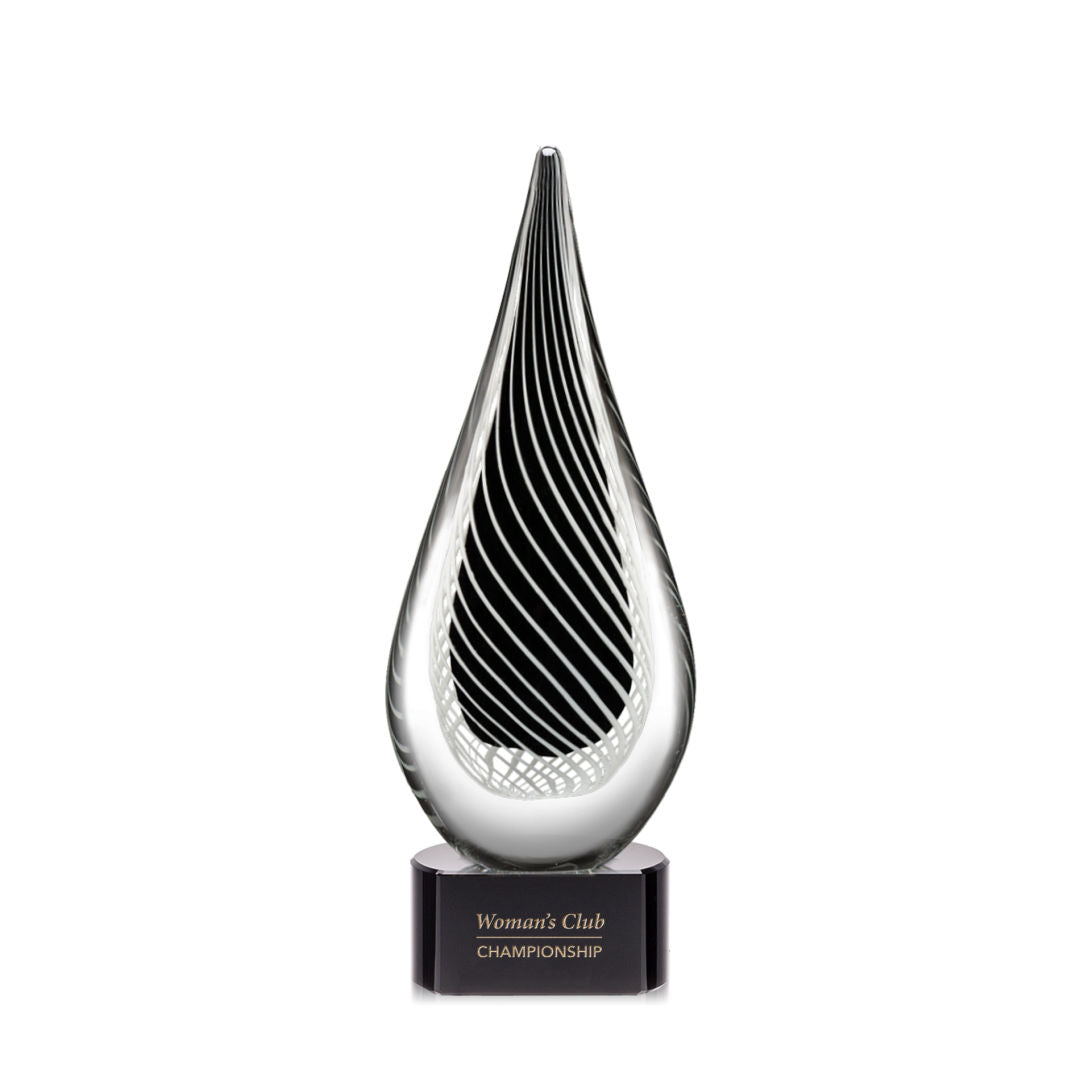 This amazing hand blown Artglass award features a black core enclosed by white swirls creating an entrancing effect. Available in 3 sizes clear or black base.