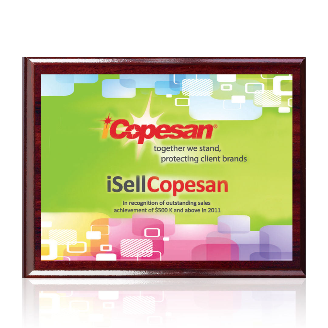 The 7" X 9" Carson plaque features artwork permanently printed and heat-fused to an aluminum sublimation plate affixed to a rosewood-colored wood product backing. Plates are available in satin or polished silver, satin or polished gold and white. Our graphic designers will be happy to suggest the plate most appropriate for the particular colors in your artwork. Also available in 8" X10", 9" X 12", 10.5" X 13" and 12" X 15" versions, and with black backing. Please specify vertical or horizontal format.