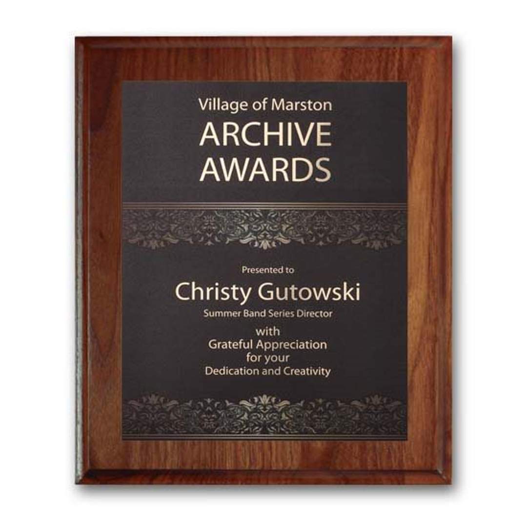 Digitally reproduce your artwork in full color on a brass or aluminum plate, mounted to our walnut plaque with cove edges.