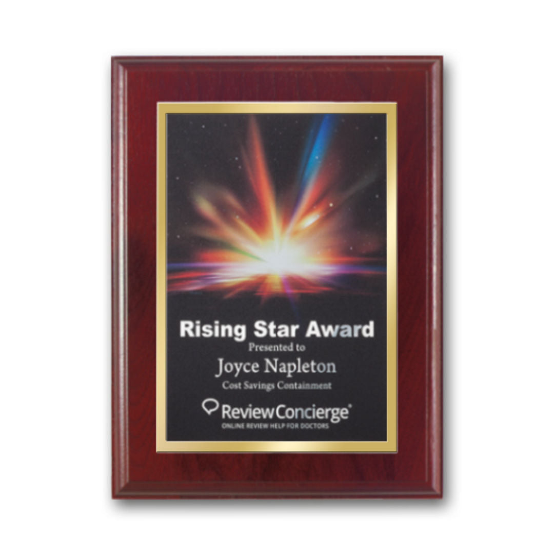 Digitally reproduce your artwork in full color on a brass or aluminum plate, mounted to our mahogany finished walnut plaque.