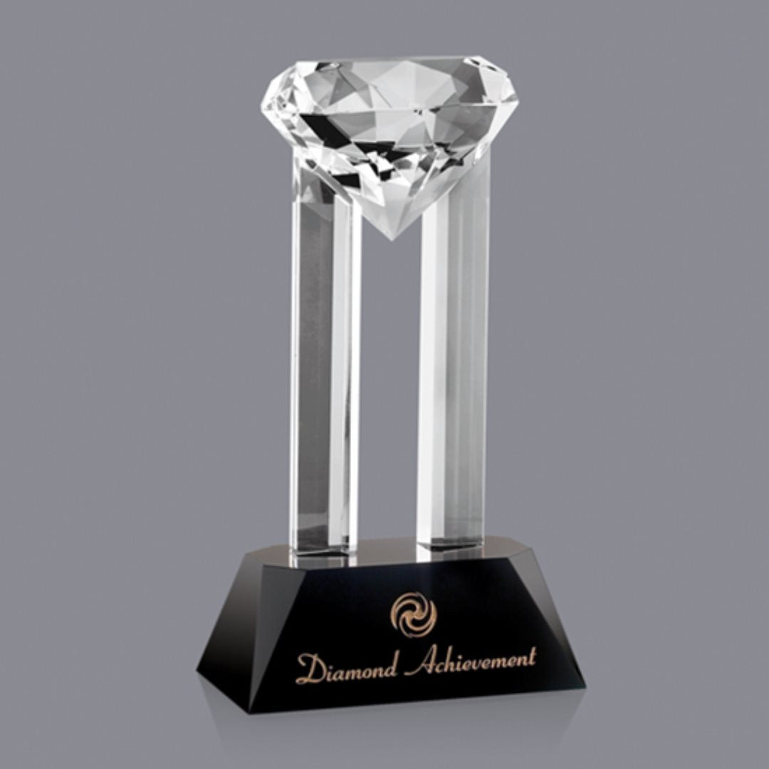 Two clear optical crystal towers cradle a large crystal diamond. A substantial black optical base with steeply sloping sides and cut corners provides the principal etching surface. Perfect for diamond-level accomplishment and for any "facet" of the diamond/jewellery industry. Colorfill optional.