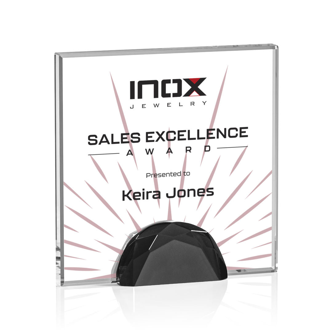 The striking Entwhistle Award features a dazzling 0.5" Starfire Crystal wedged between two multifaceted Black crystal diamonds. This impressive award is perfect for any accomplishment. Let your message POP with full color VividPrint!