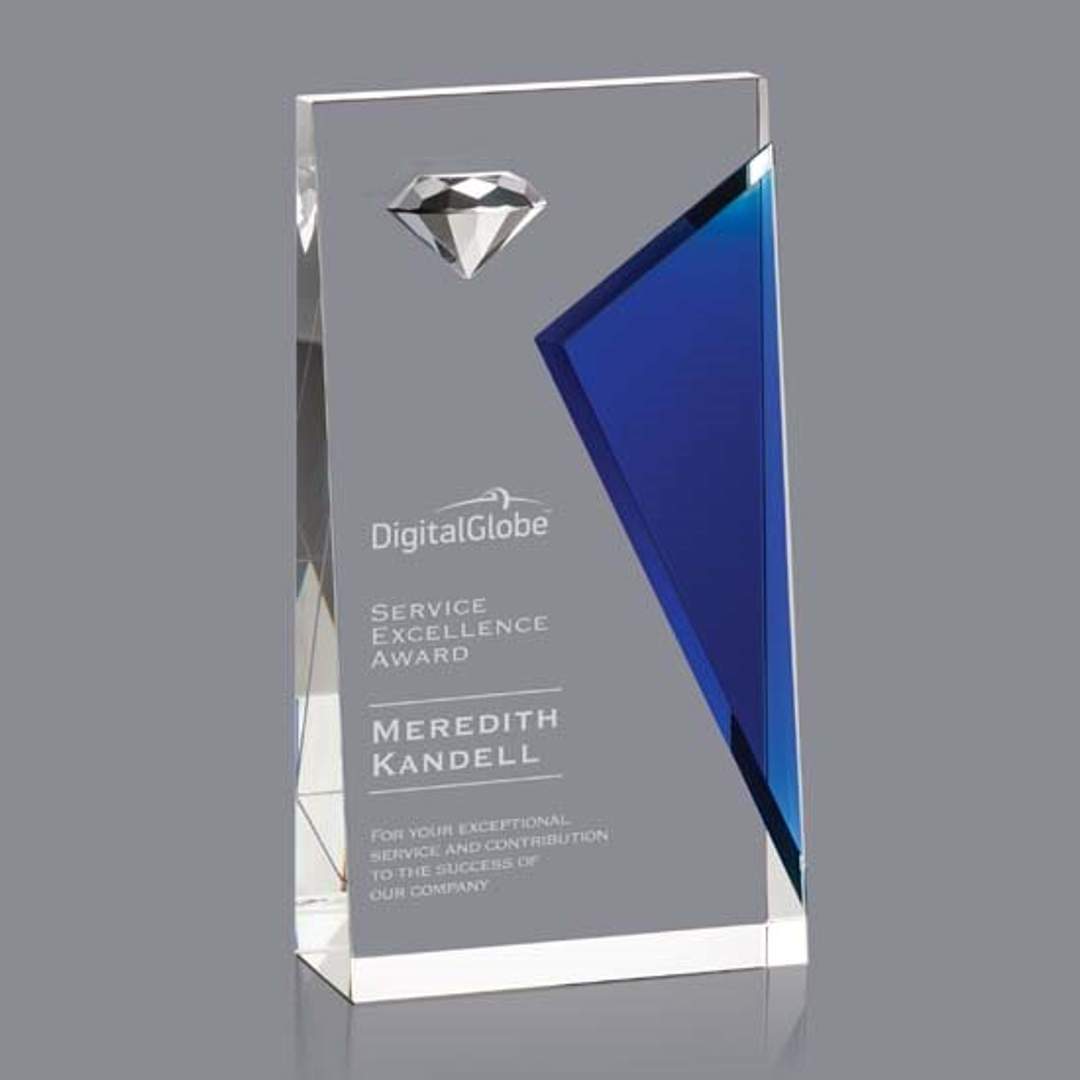 Our tapered optical crystal tower is accented with a dramatic cobalt optical crystal accent and highlighted with a sparkling faceted crystal diamond to give your accomplishment 100 carat prominence.