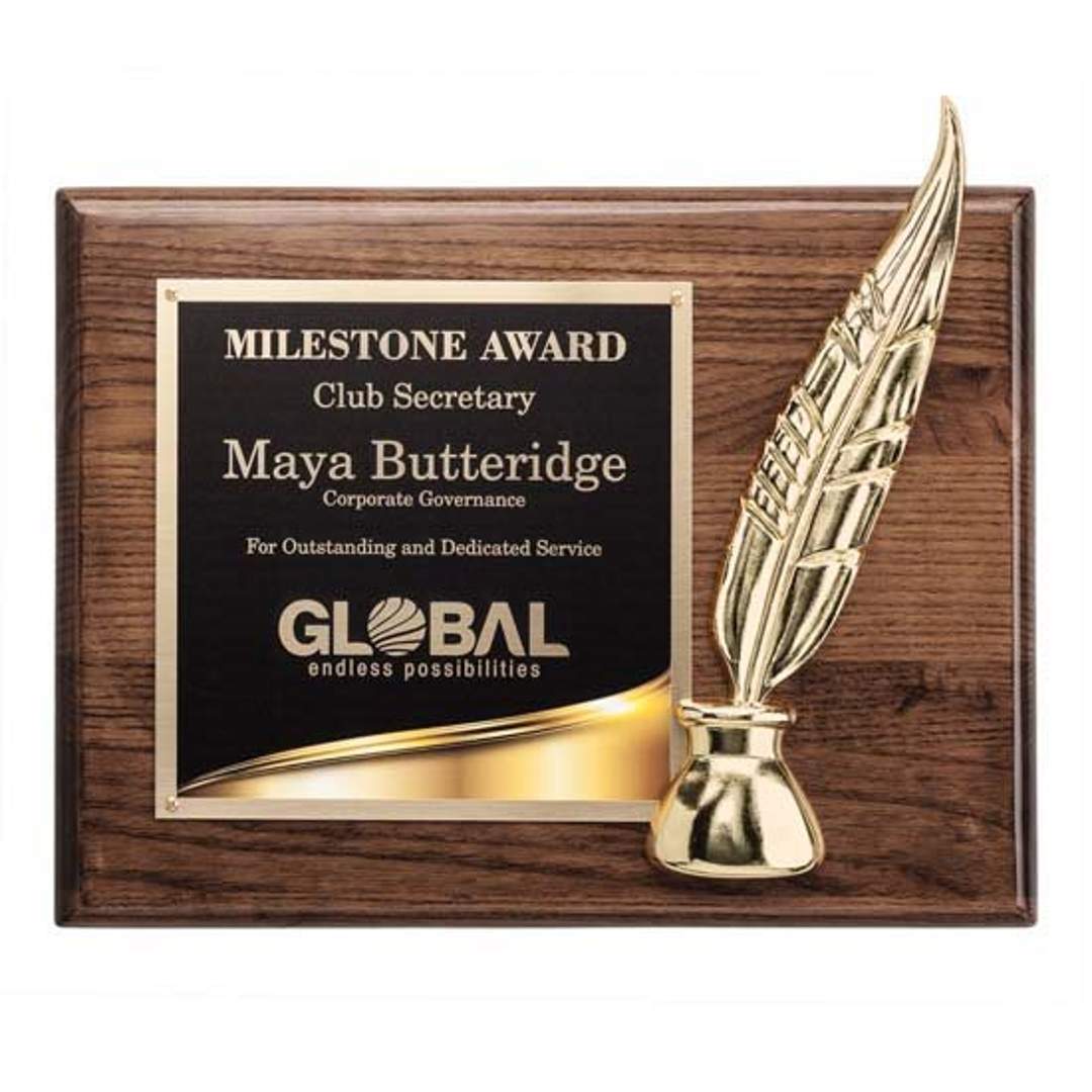 Honor your dedicated officers with our intricate, bright gold finished ink & quill metal casting mounted to a walnut piano finish plaque with a Liquid Gold series brass plate to display any accolade proudly.