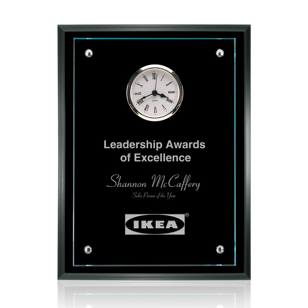 The 7" X 9" Somerset plaque features a clock insert in the 3/8" starfire glass and a black MDF backing. Also available in 8" X 10" and 9" X 12" sizes...