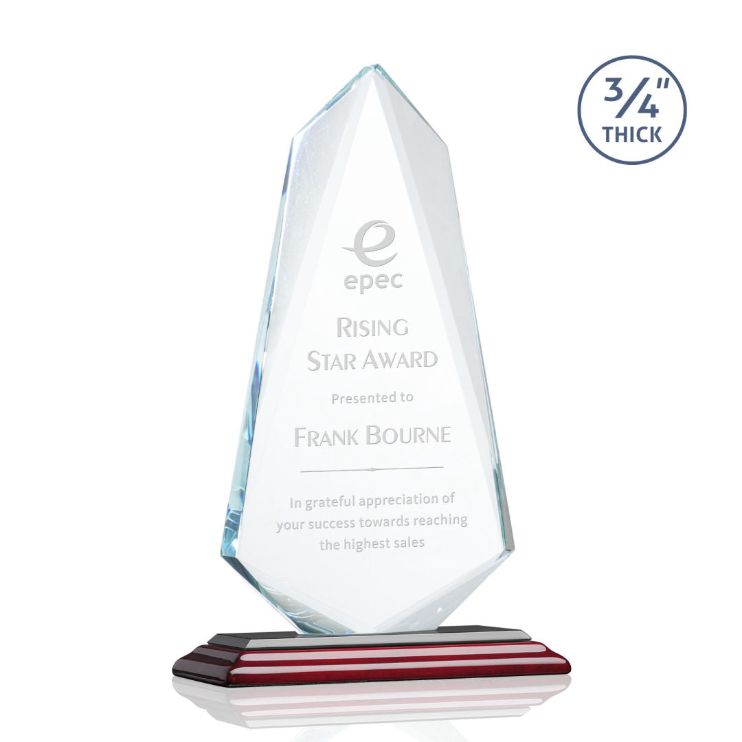 An exquisite 0.75" Thick Starfire Crystal award features deep bevels that frame your prestigious accomplishment with sparkling light. Mounted on a triple-stepped piano-finished rosewood base, the Sheridan is an impeccable award to highlight an exceptional achievement.
