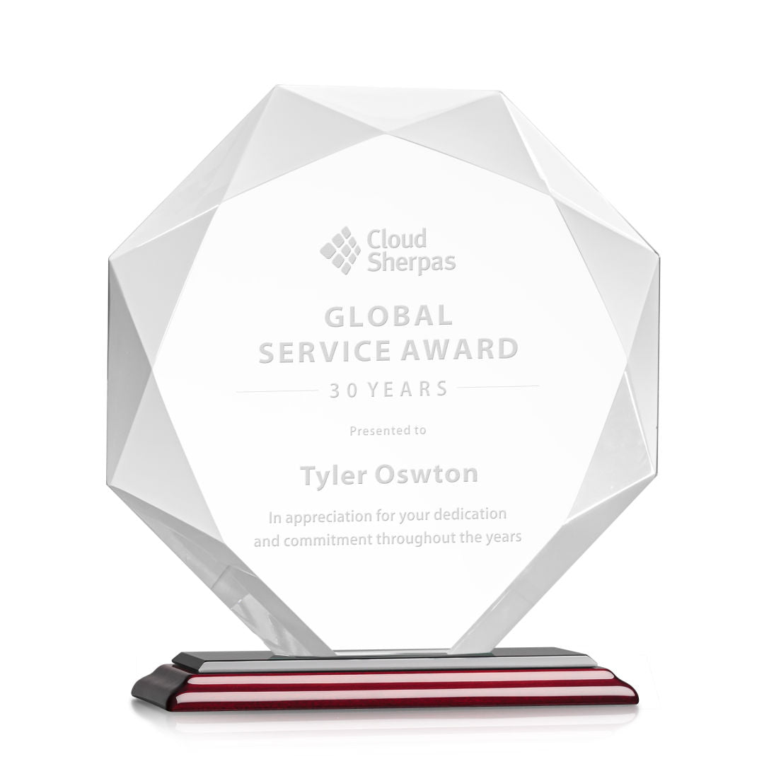 Striking Starfire Octagon award refracts light through all of its facets creating a brilliant display for achievement recognition. Mounted on a triple-stepped piano finished rosewood base.