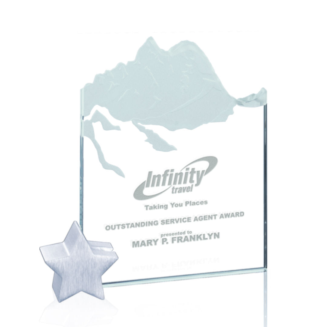 The 7" high Hillstone is a simple jade glass rectangle transformed into a symbol of grandeur and inspiration by deeply carved mountain relief on the upper surface. Rather than a glass base, the Hillstone uses an aluminum corner disk or star holder, in either gold or silver finish. Also available in a 9" version and in starfire glass.