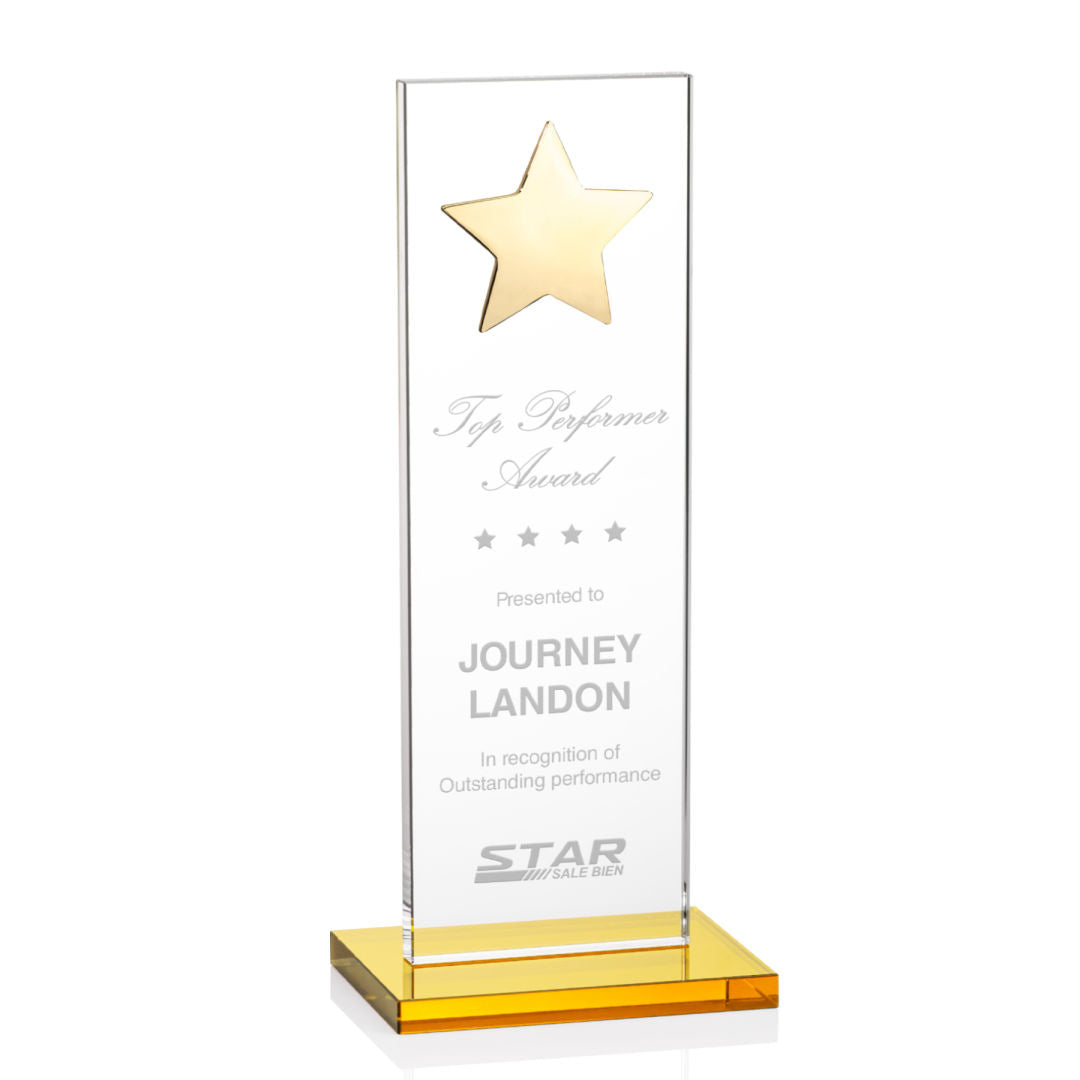 This illustrious Starfire Crystal award stands upright on an elegant Amber base and is adorned with a Gold star for optimal view. The perfect recognition piece for a star performer. Also available with Silver star.