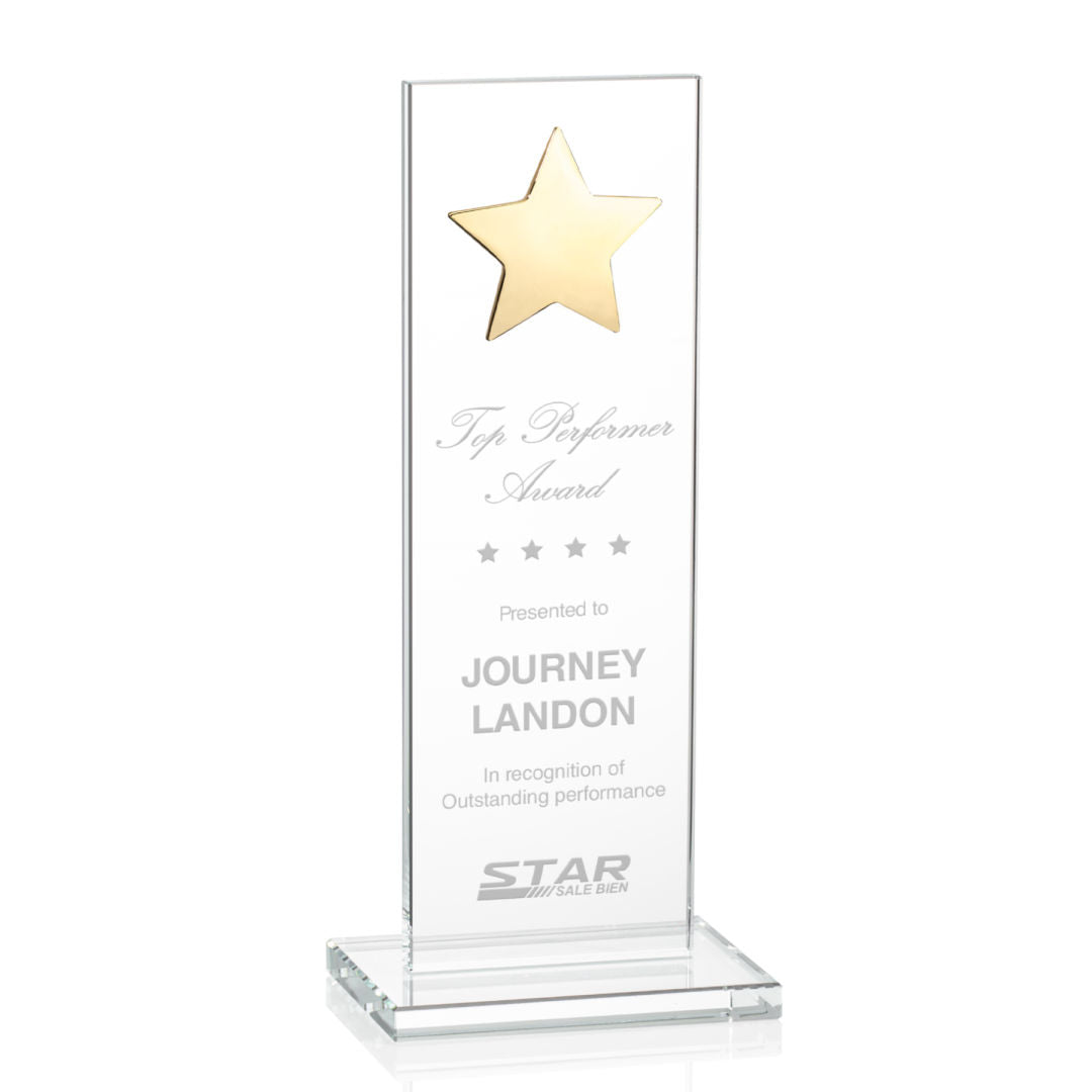 This illustrious Starfire Crystal award stands upright on an elegant Starfire base and is adorned with a Gold star for optimal view. The perfect recognition piece for a star performer. Also available with Silver star.