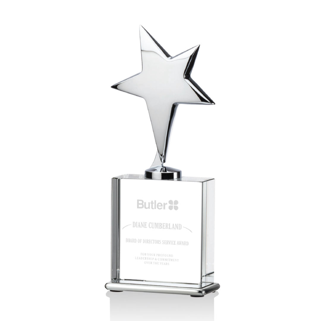 This exquisite silver finished cast metal star proudly salutes any winner, rising from an optical crystal base edged with a silver metal pedestal, in contemporary style.
