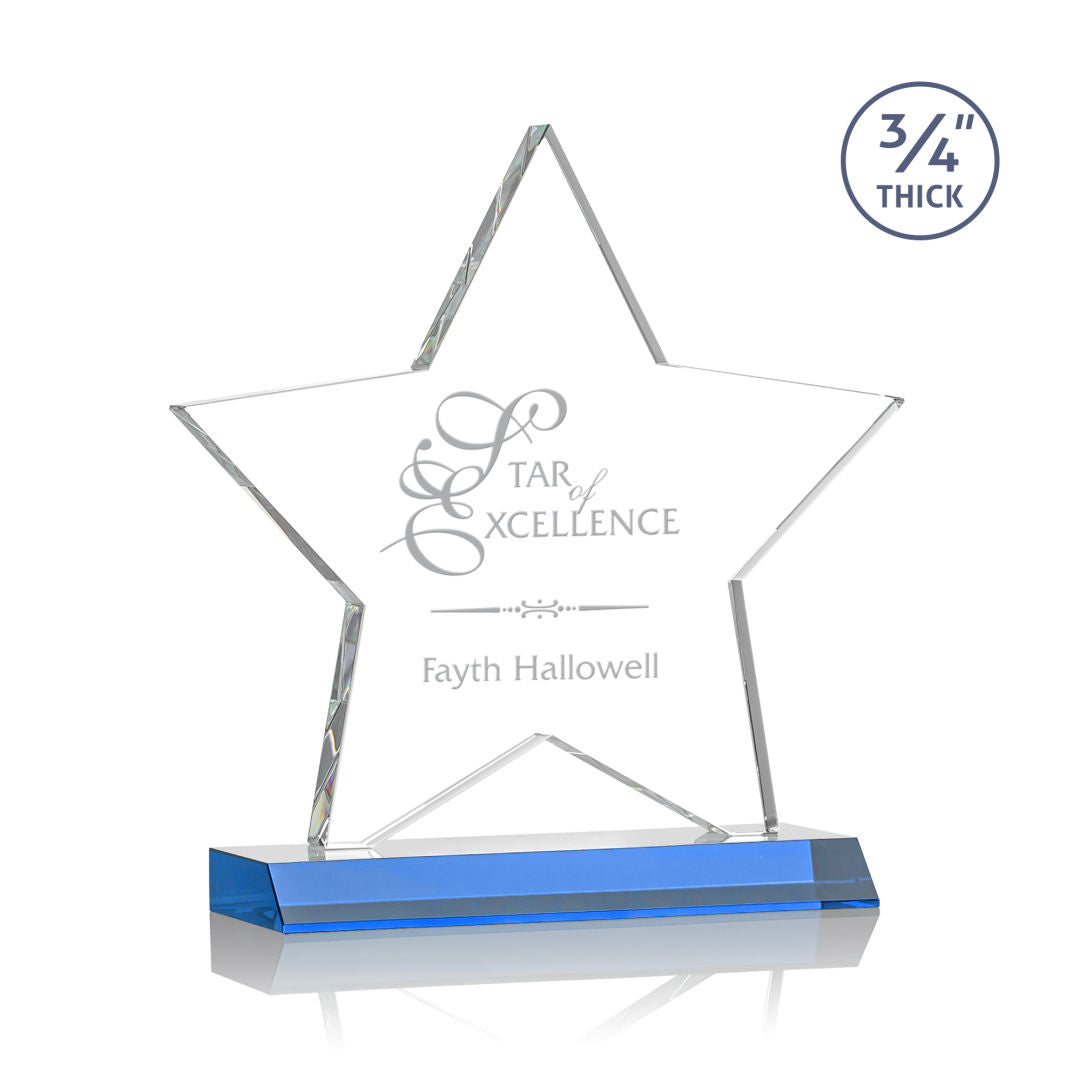 The Chippendale Star Award features a magnificent Optical Crystal Star mounted on top of a Sky Blue front mitered crystal base. The perfect recognition award for a Star Performer. 2nd position etch optional.