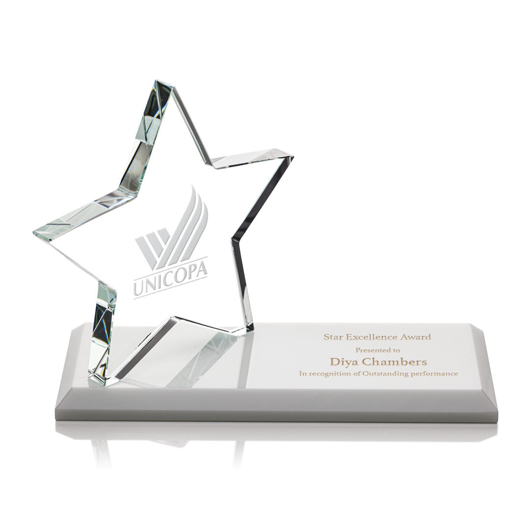 The Northam Star features a sparkling 4.5" Starfire Crystal Star mounted on your choice of a colored crystal base or rosewood Albion base. Second position Deep Etch optional.