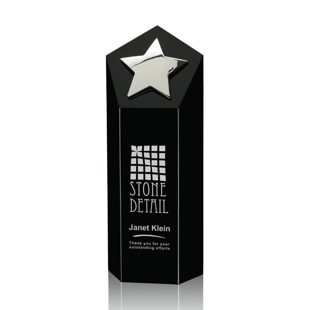 Sleek Black Optical Crystal features a gleaming Silver Cast Metal Star. The perfect award to recognize a Star Performance. Also available in Gold.