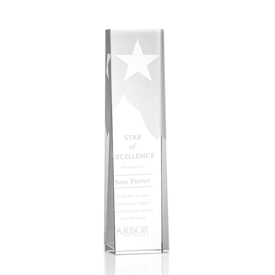 The Artemus Optical Crystal Star Award is a thick, tapered freestanding tower. Featuring a lightly surface-etched top that transforms your momentous accomplishment into a mountainous peak, reaching high towards a clear optical star. A Stellar award to recognize a Star Achievement.