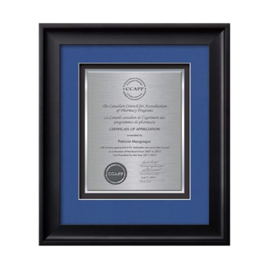 Commemorate a milestone achievement with Waterleaf Studios’ Certificate collection. Honor years of service, display diplomas, service awards, company mission statements, mergers & acquisitions or extraordinary achievements with these impressive statements of accomplishment. Your words of recognition are reproduced using our polished edged Double Plated TexEtch process with your choice of 2 standard mattes and framed in our museum quality Yorktech molding.