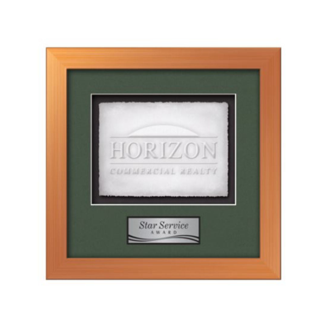 The Eldridge Cast Paper Framed Award capitalizes on the contrast between the organic, delicate nature of cast paper art and the stunning permanent gallery presentation for achievement recognition. This framed work of art is surrounded by our exquisite Eldridge molding, your choice of 2 standard mattes and a personalization plate to give your accomplishment a remarkable, dramatic display.