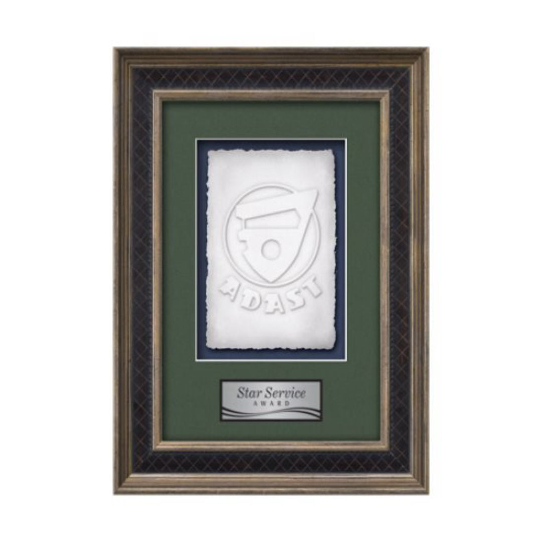 The Tuscan Cast Paper Framed Award capitalizes on the contrast between the organic, delicate nature of cast paper art and the stunning permanent gallery presentation for achievement recognition. This framed work of art is surrounded by our exquisite Tuscan molding, your choice of 2 standard mattes and a personalization plate to give your accomplishment a remarkable, dramatic display.